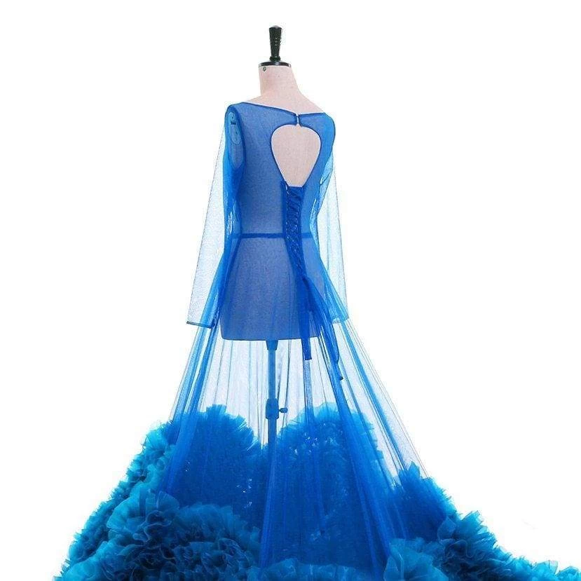 Handgemachtes spektakuläres elektrisches blaues Abendkleid mit Blumen wirken sich auf Dekorationen und transparenten Körper aus.