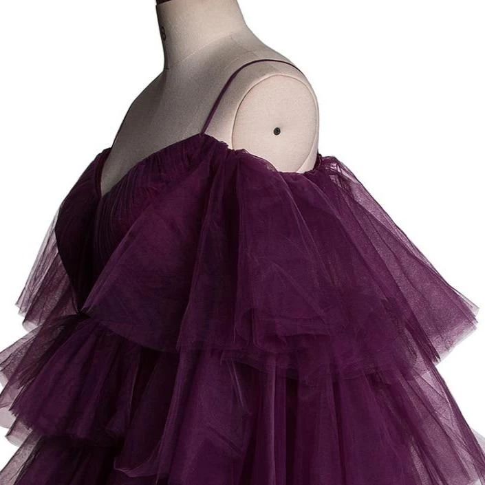 Handgemachtes, schulterfreies, langes Abendkleid aus offenen Tüllärmeln.