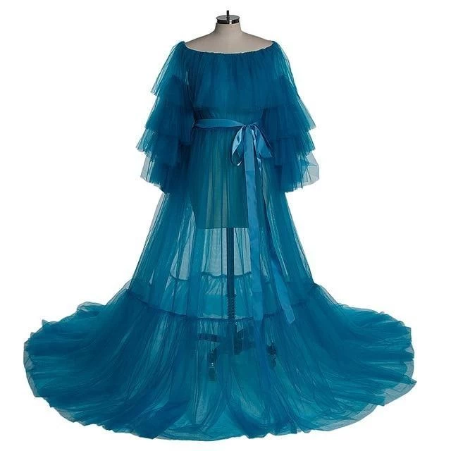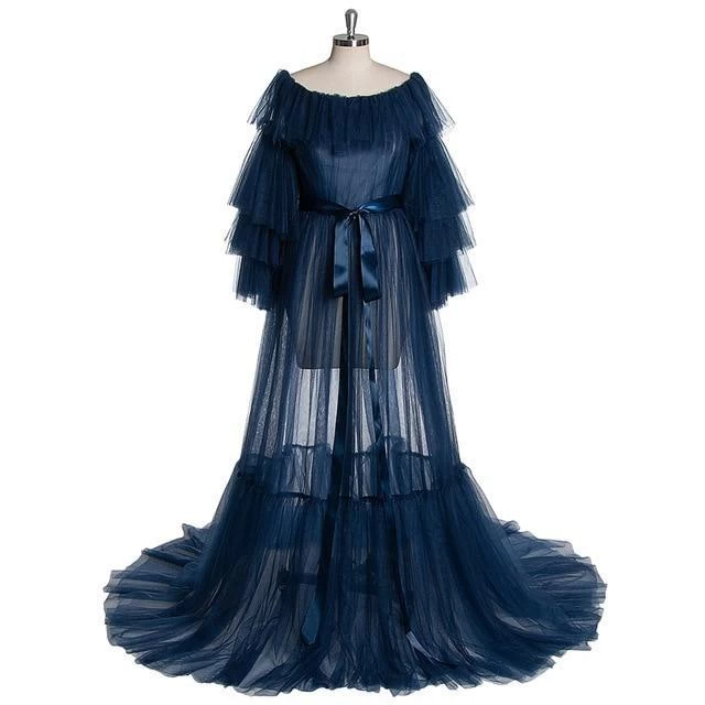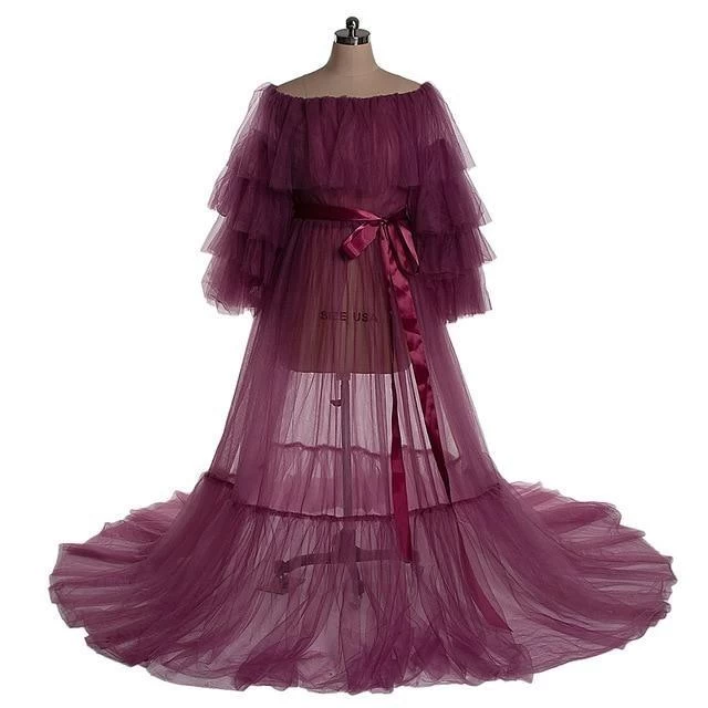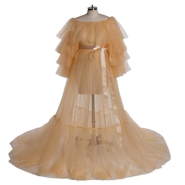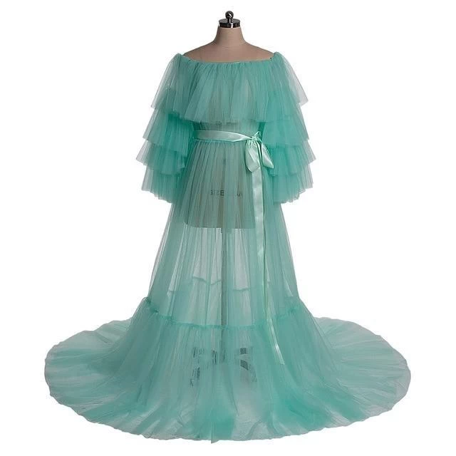 Schulterfreies Abendkleid mit mehrschichtigen Ärmeln und transparentem Chiffon.