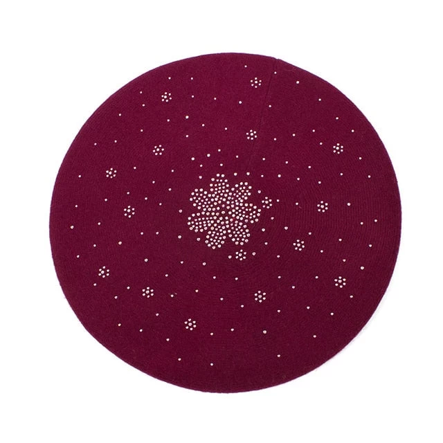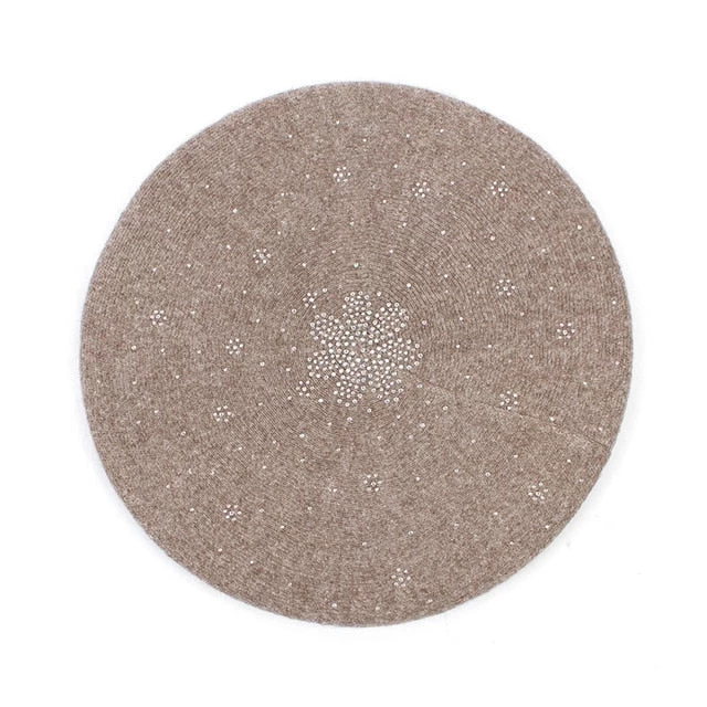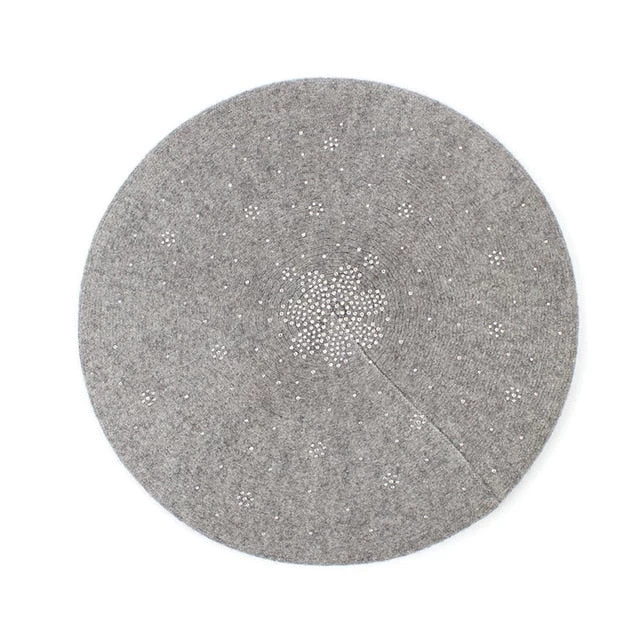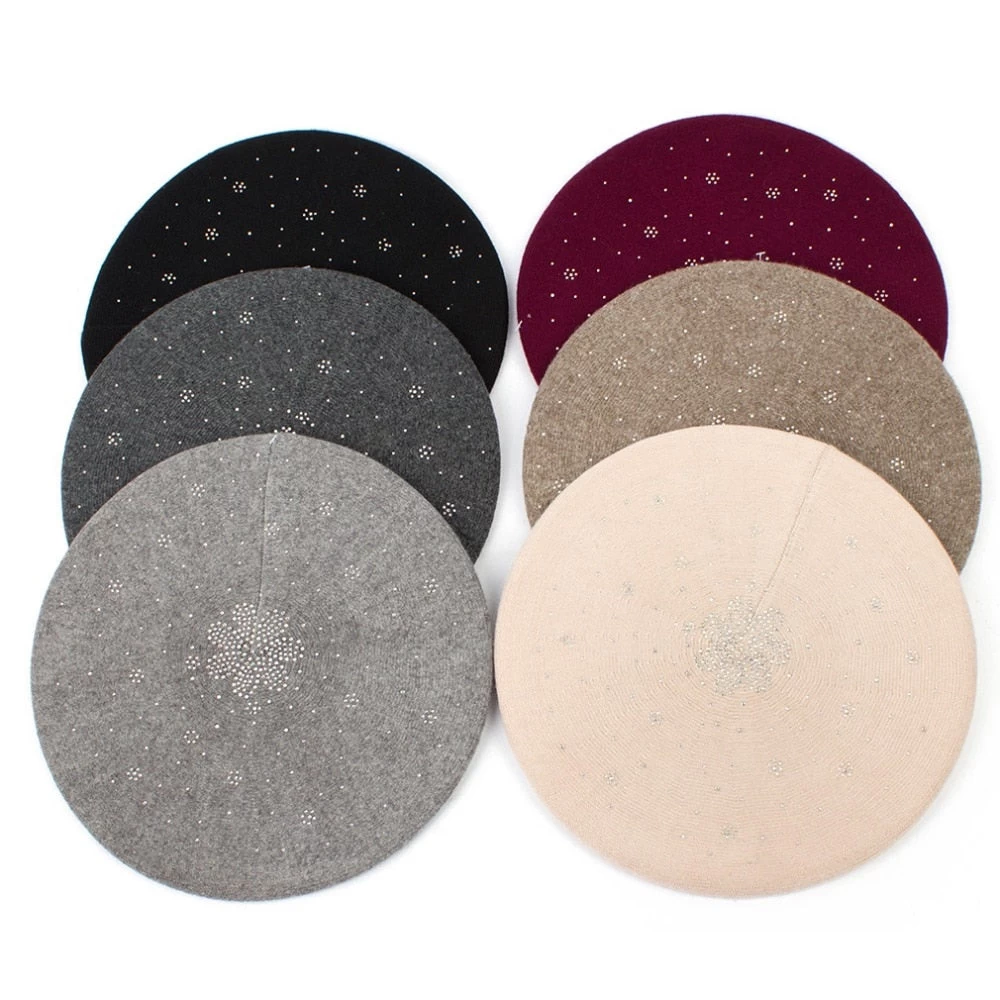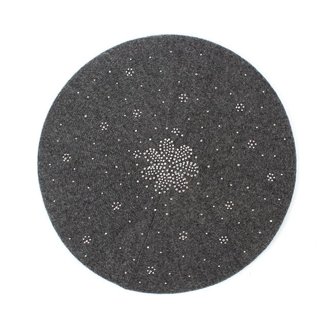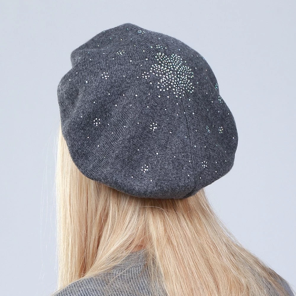 Gestrickte Baskenmütze im lässigen Stil, verziert mit Strasssteinen.