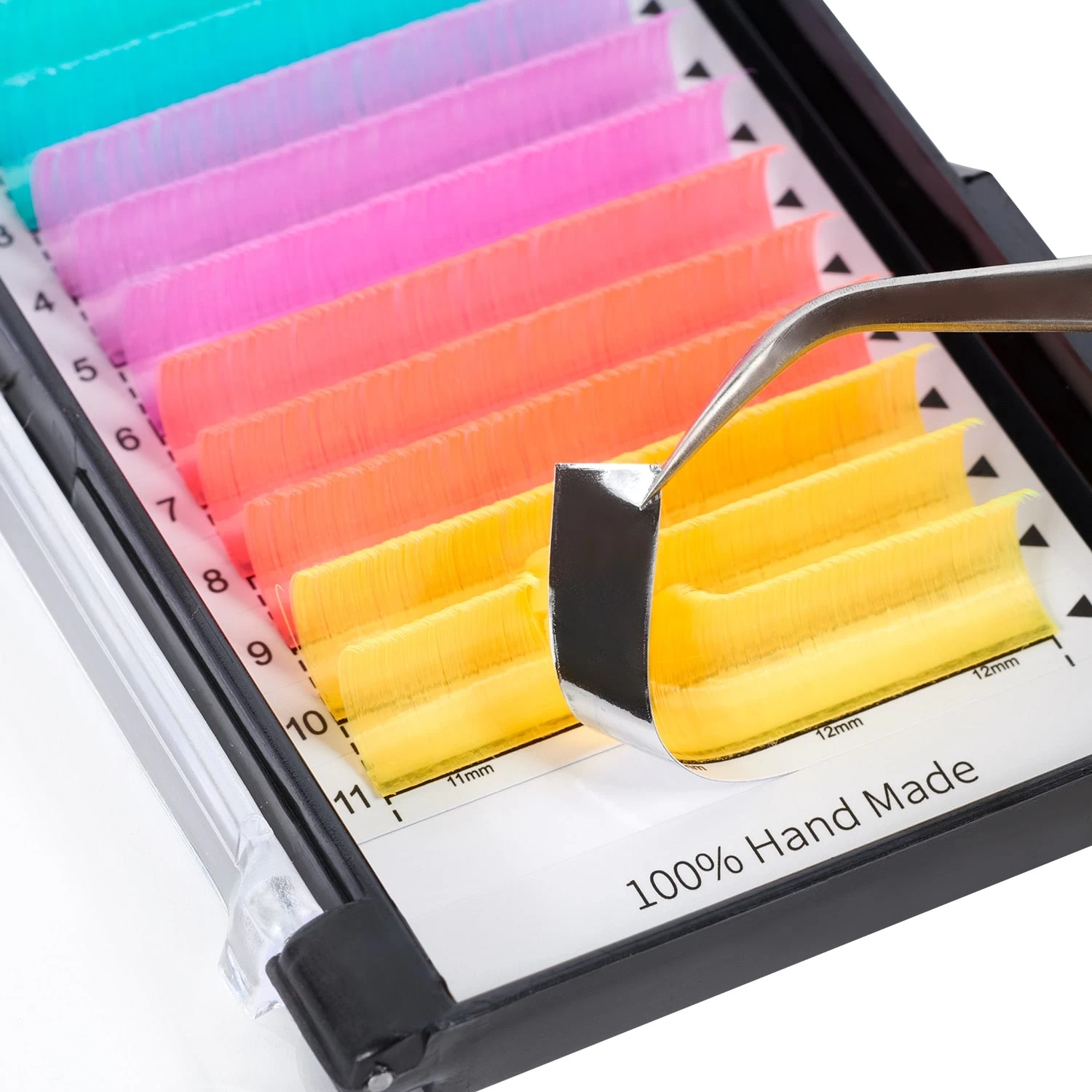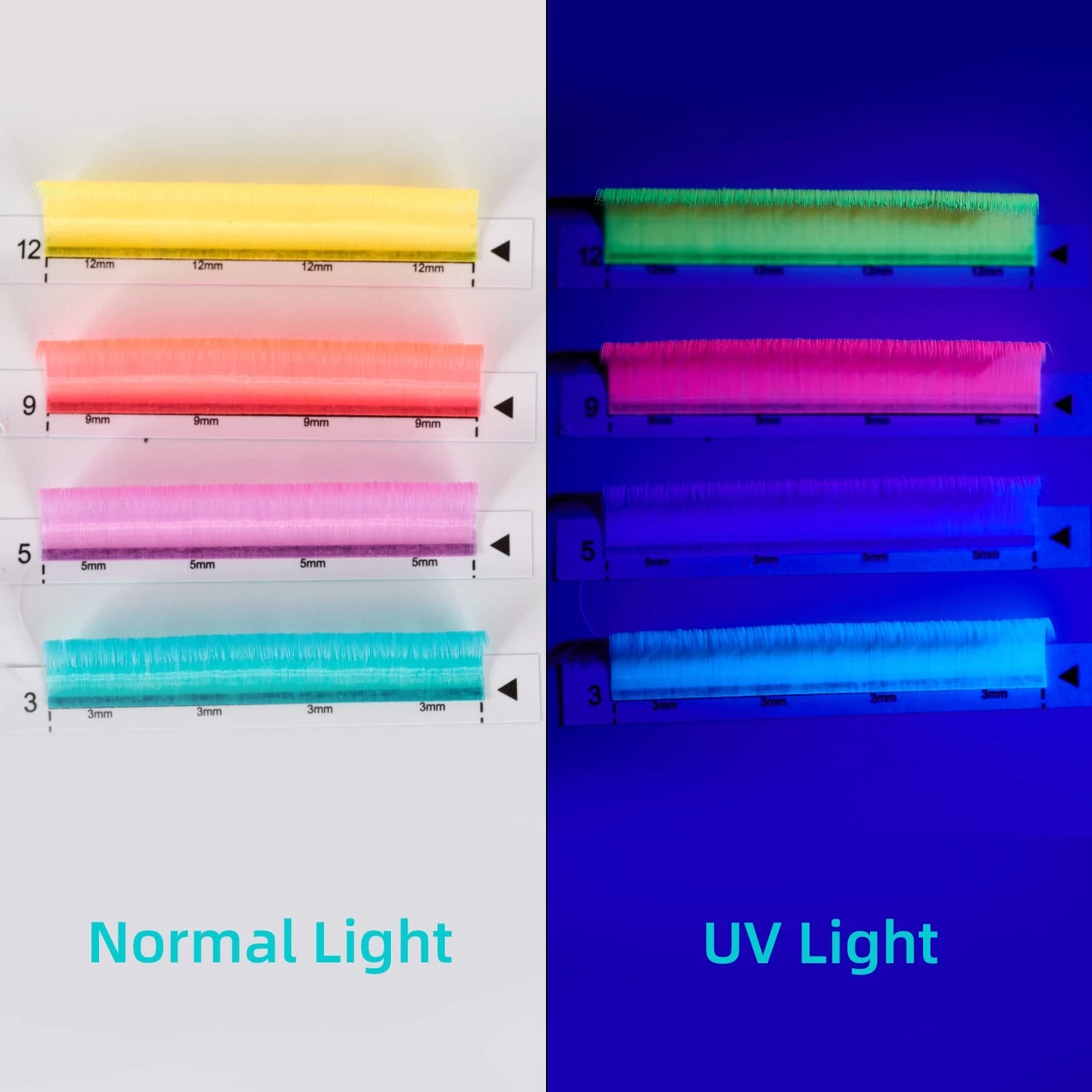 Handgefertigte Neon Glow in the Dark Extensions für falsche Wimpern in verschiedenen Farben.