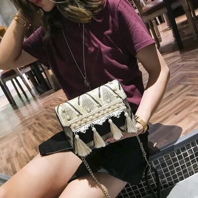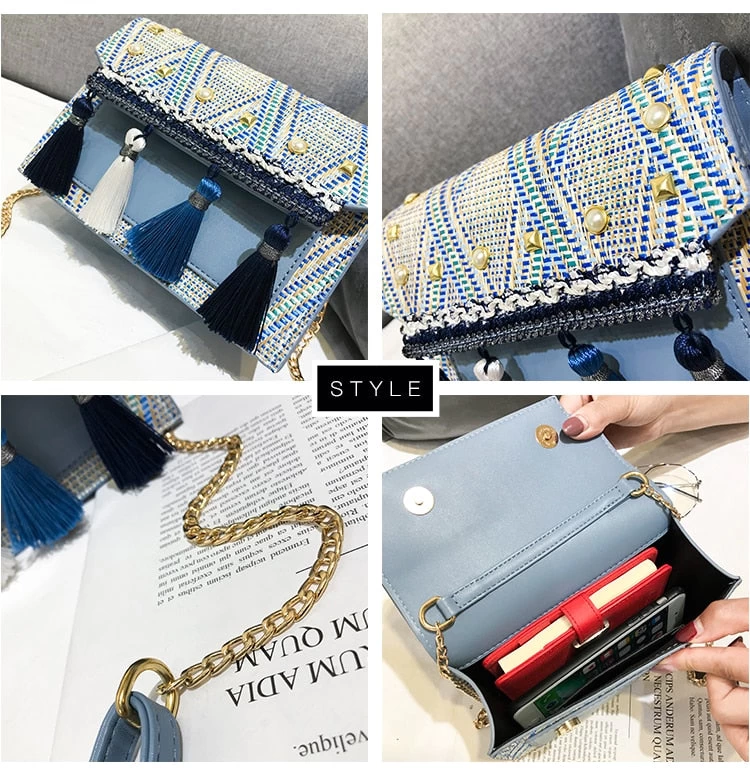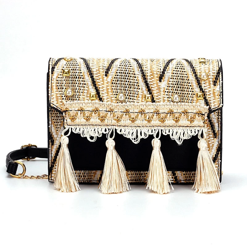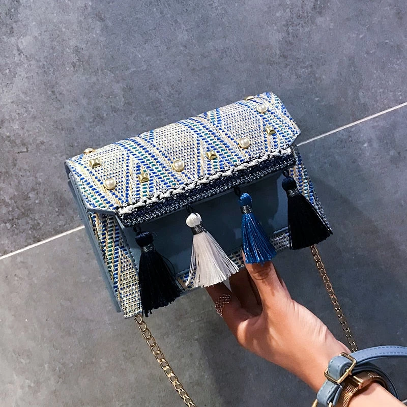 Kunstlederhandtasche mit Quasten, Perlen, Metallkette und trendigen Farben.