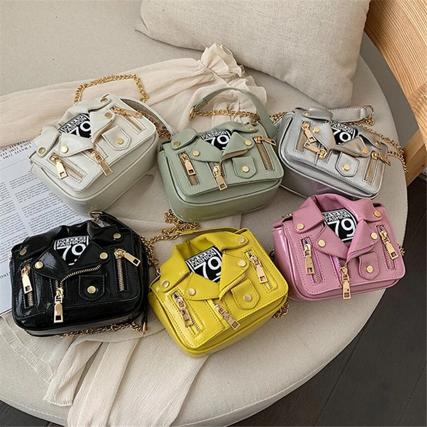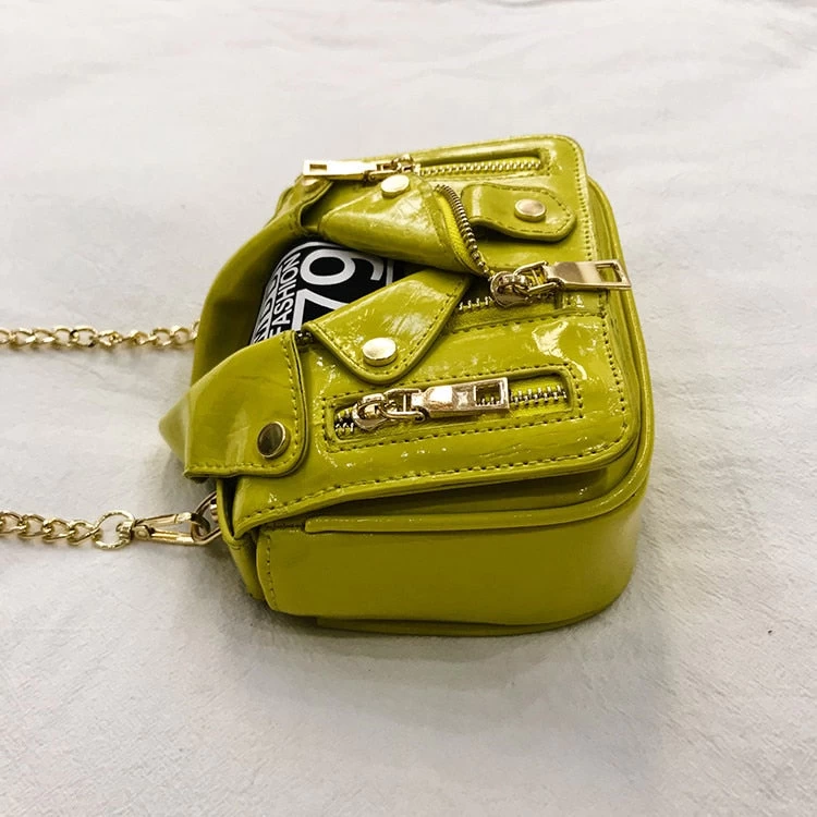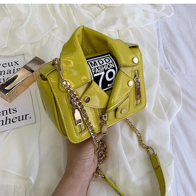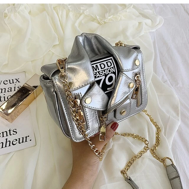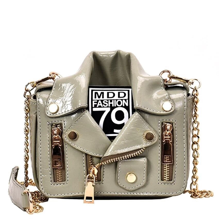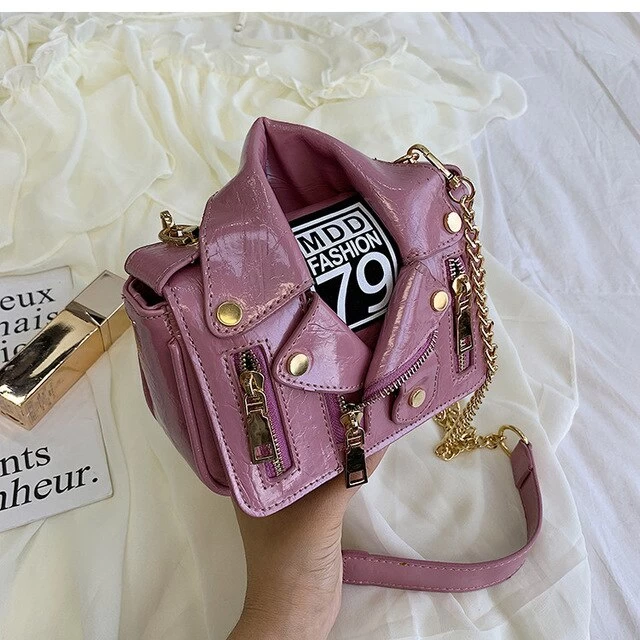 Genietete Handtasche in Form einer Motorradjacke.