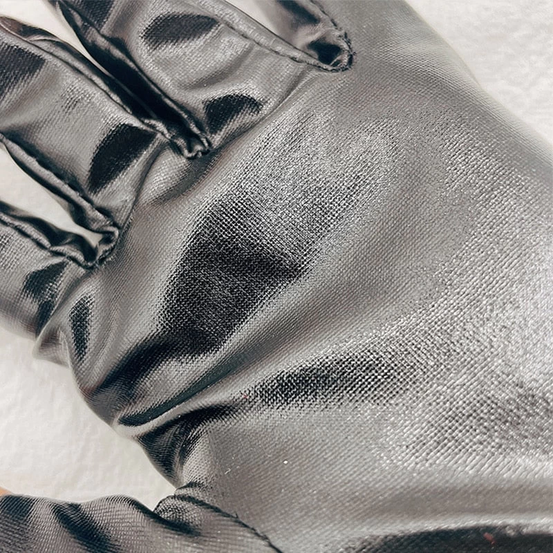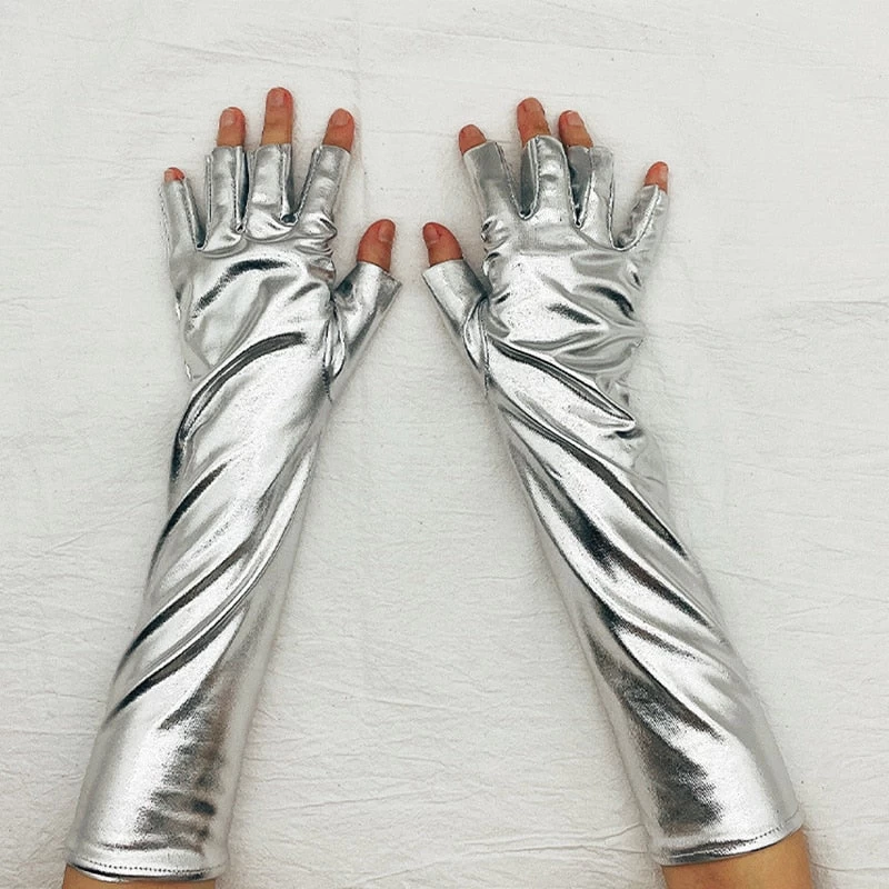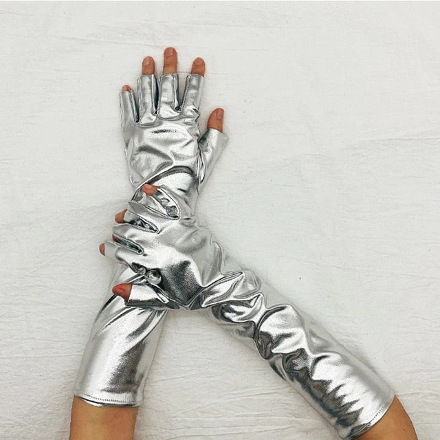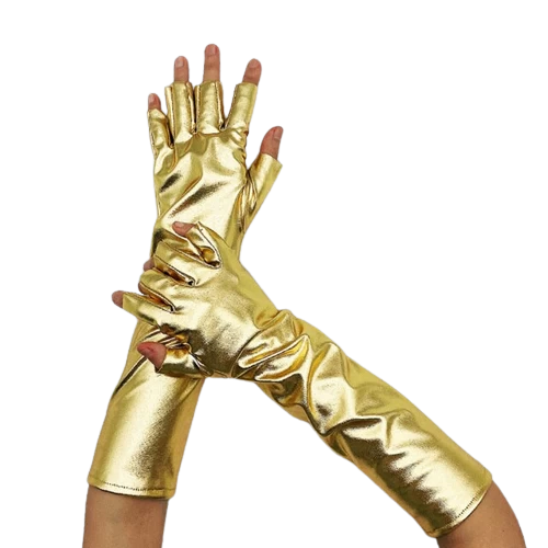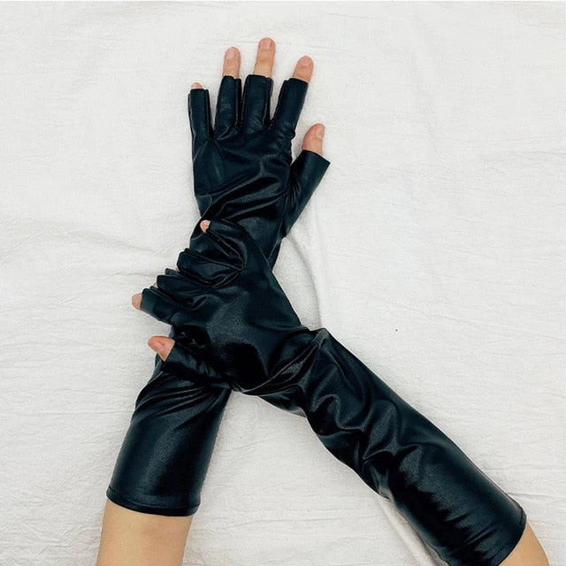 Lange Kunstlederhandschuhe, mit bloßen Fingern in verschiedenen Farben.