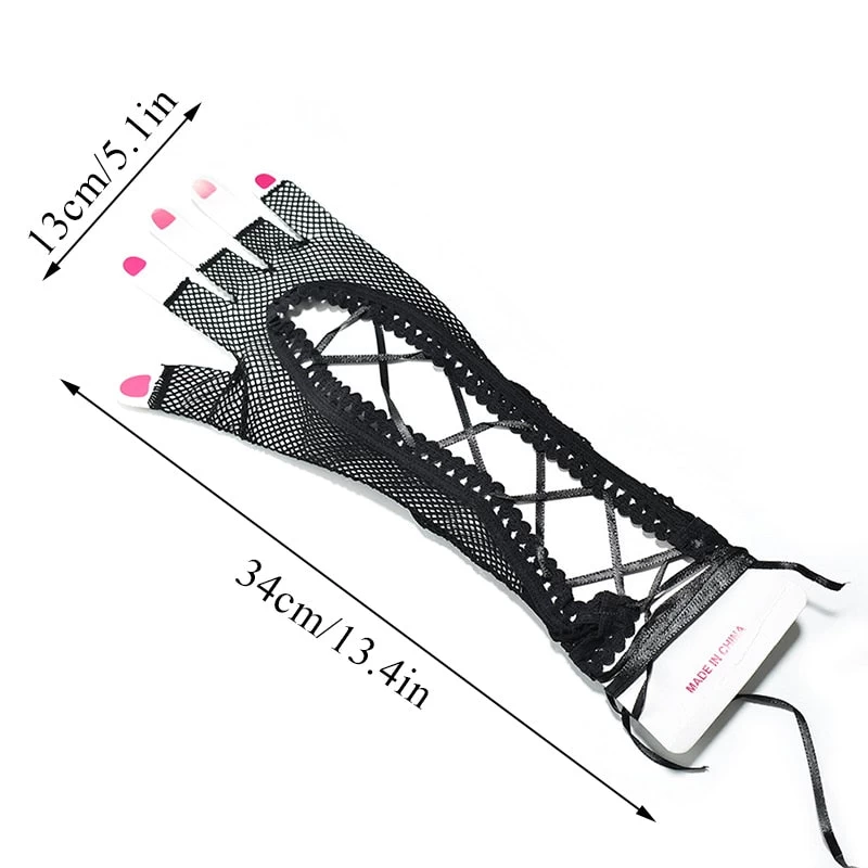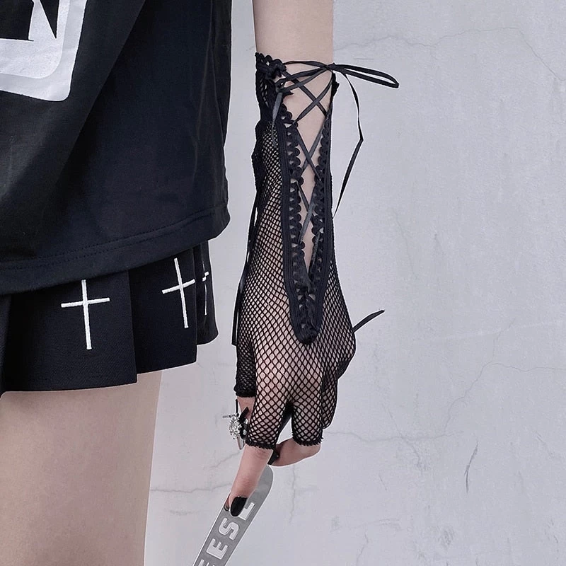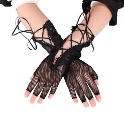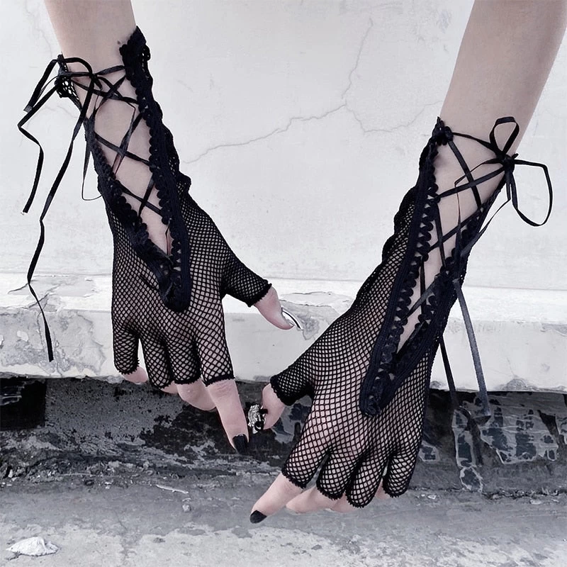 Mesh-Handschuhe mit Schnürsenkeln und bloßen Fingern.