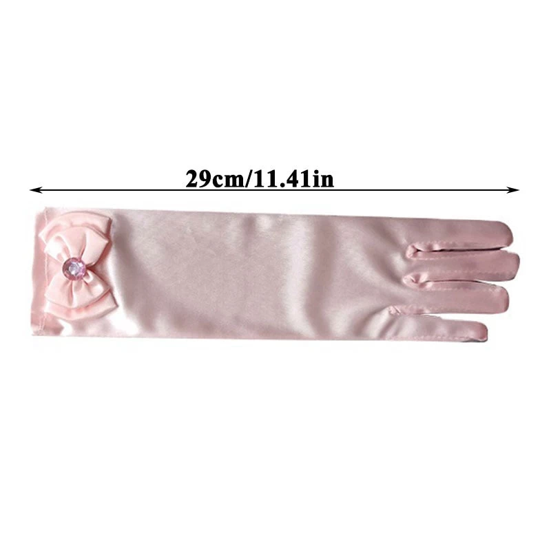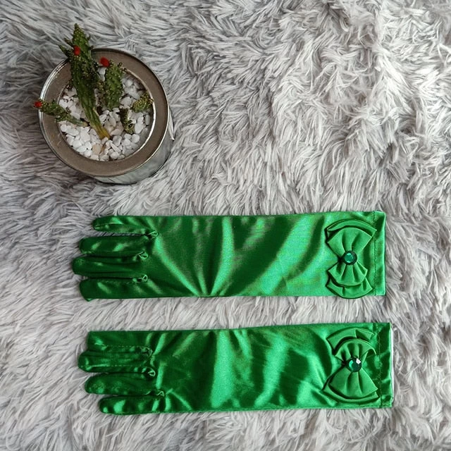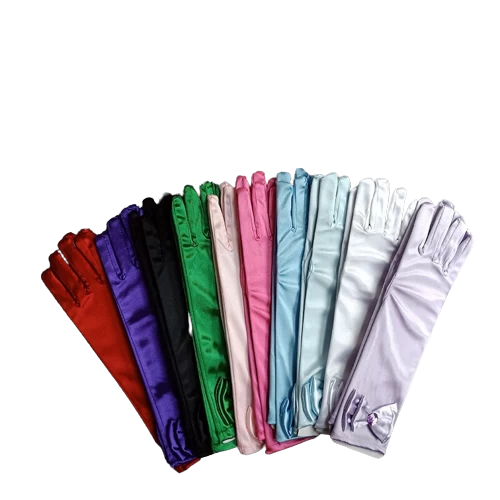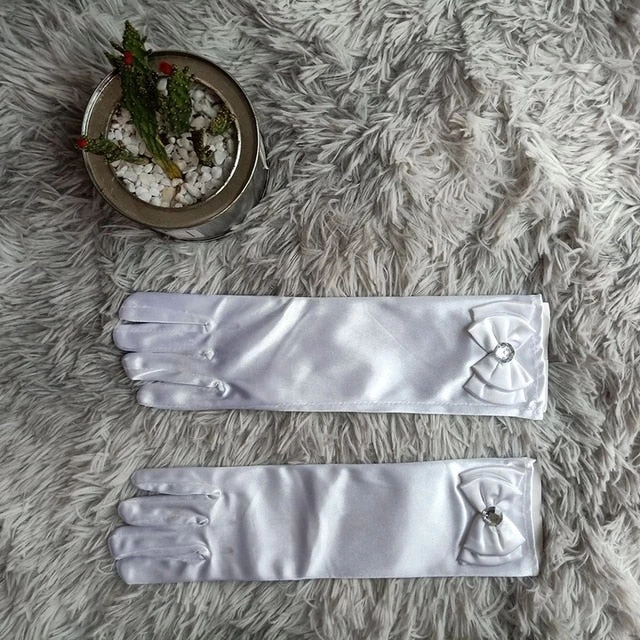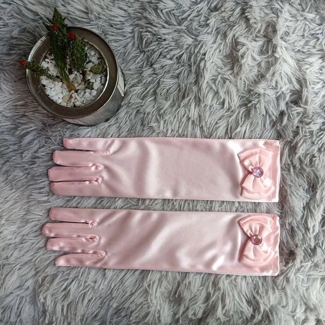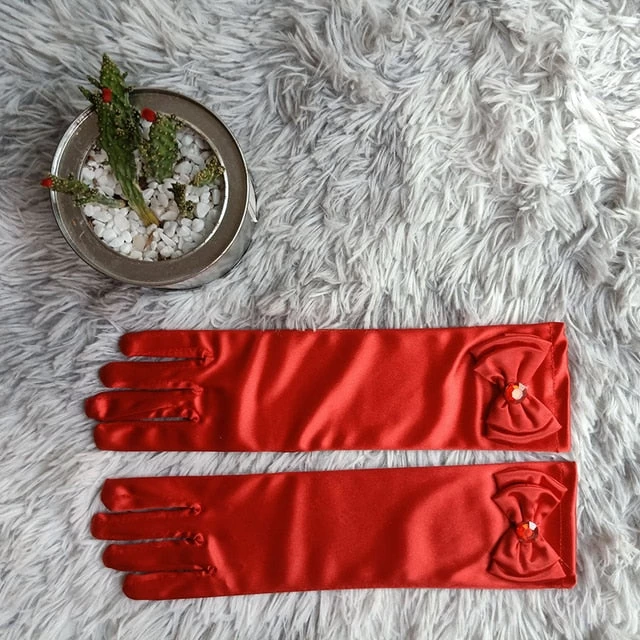 Lange glänzende Handschuhe mit Schleifenverzierung.