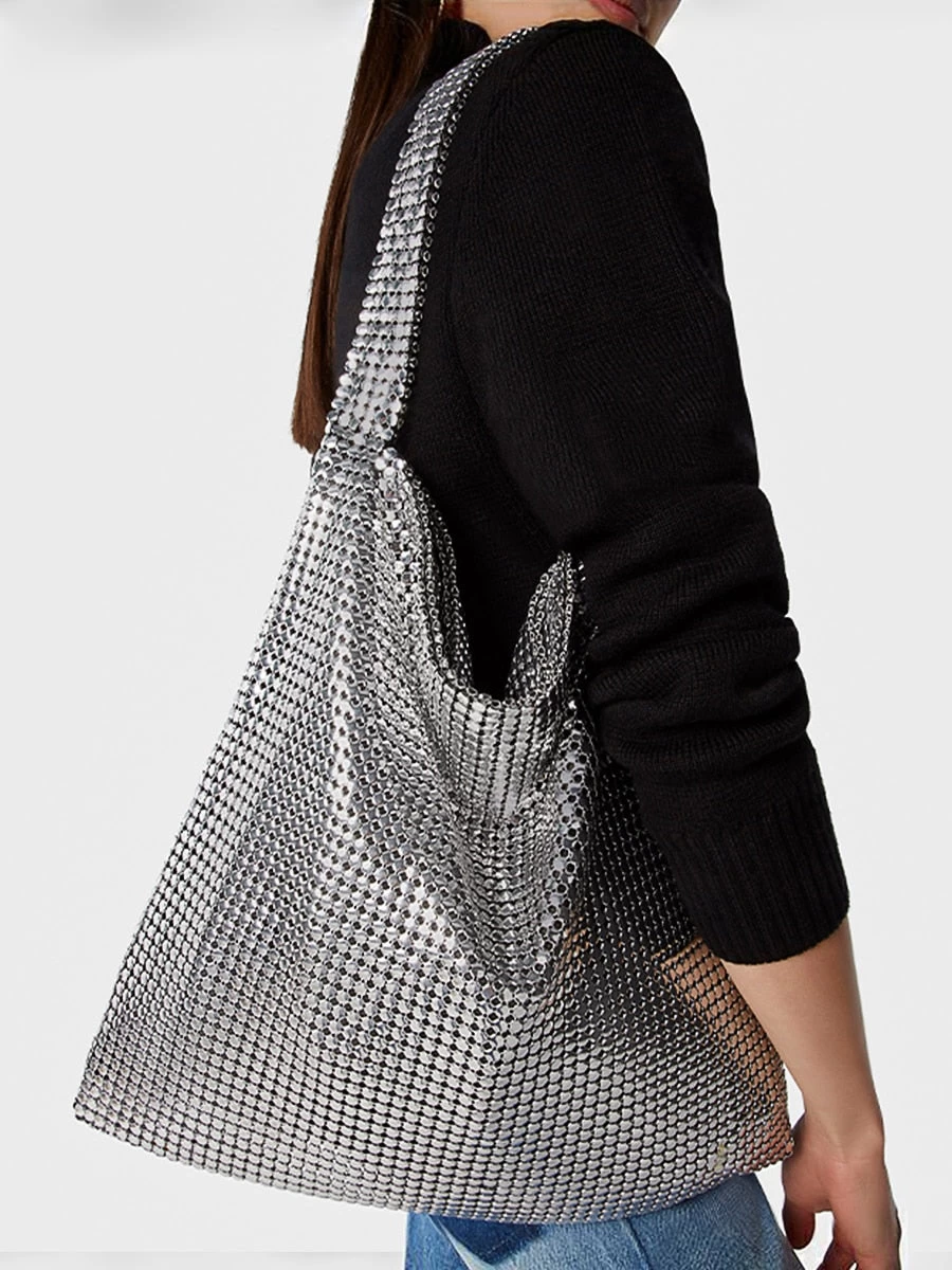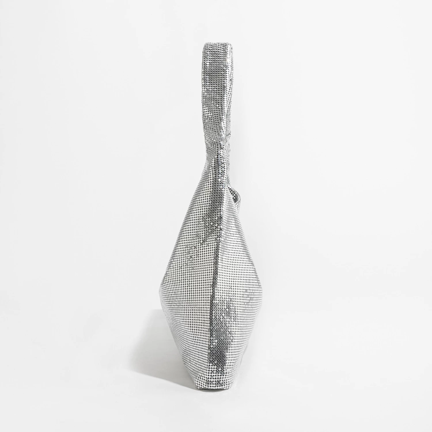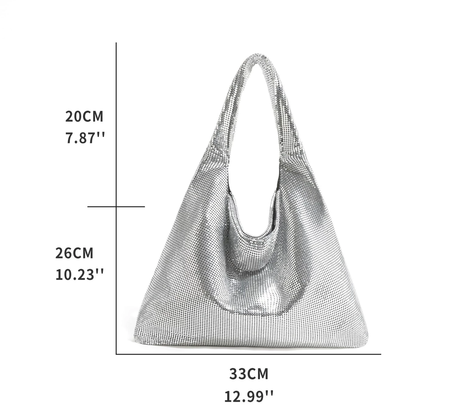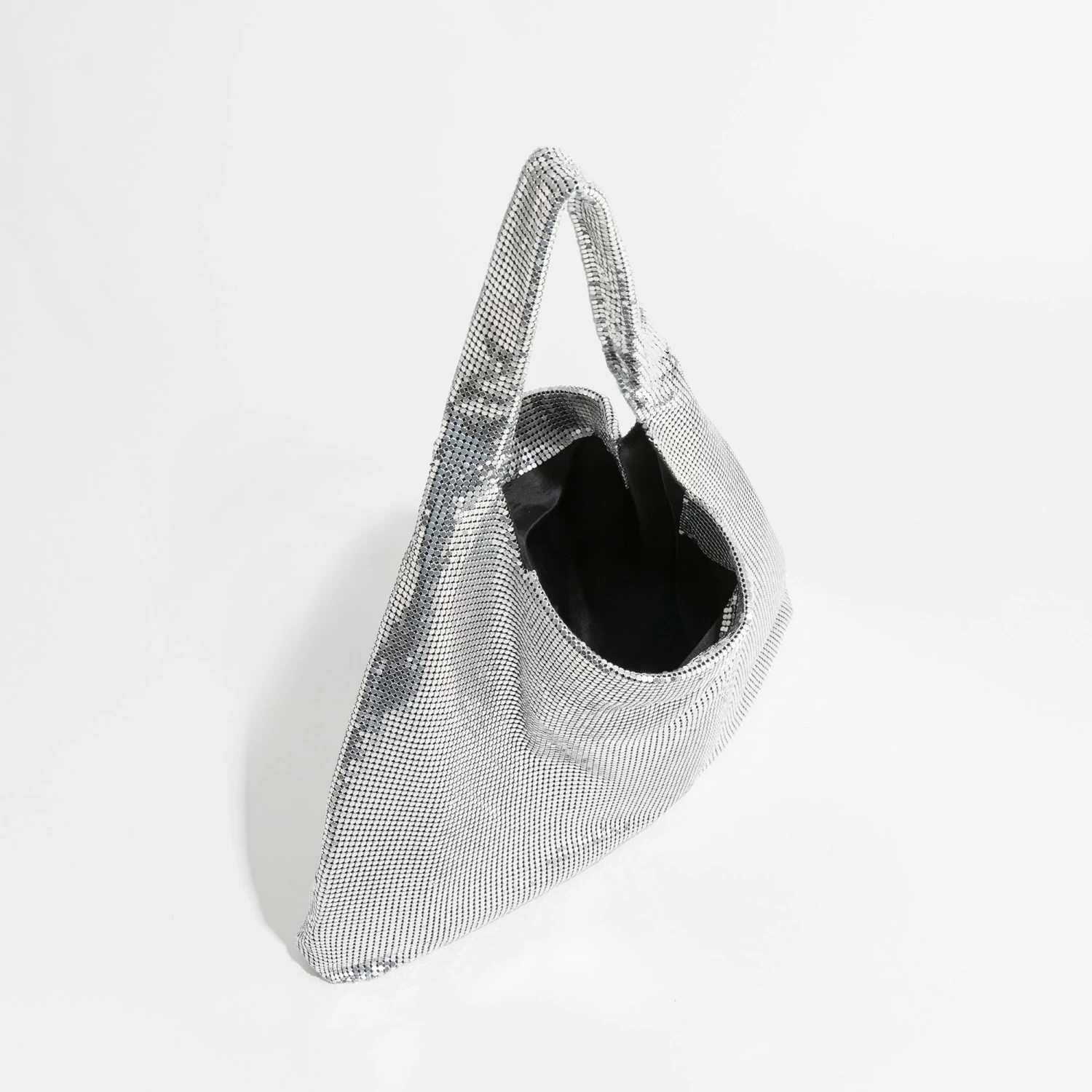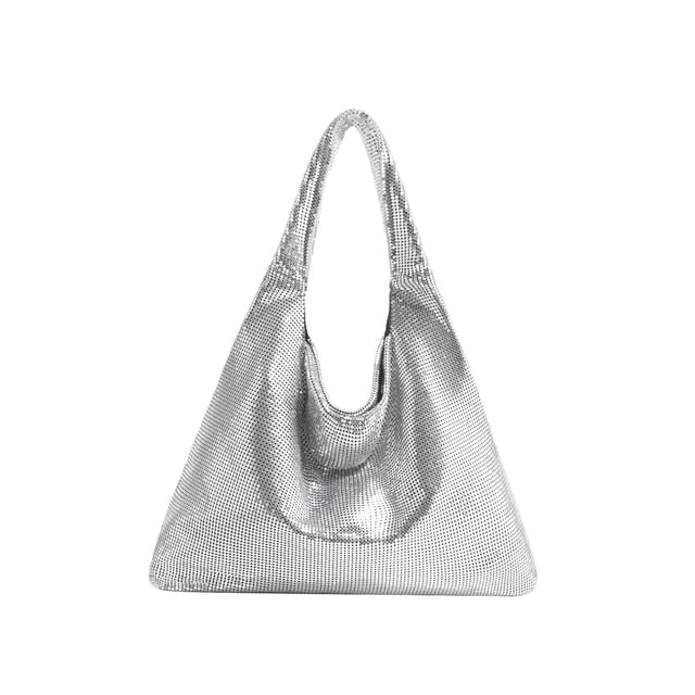 Abendtasche mit glänzenden Pailletten und dreieckiger Form.