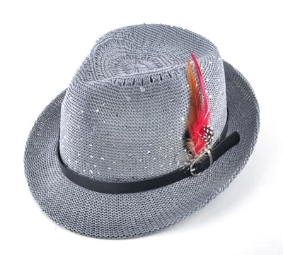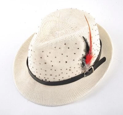 Strohhut im Panama-Stil, verziert mit einer Feder.