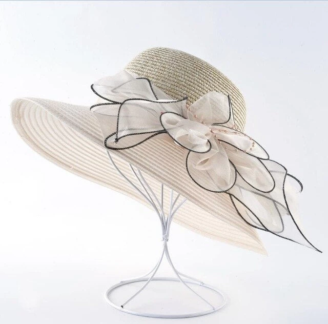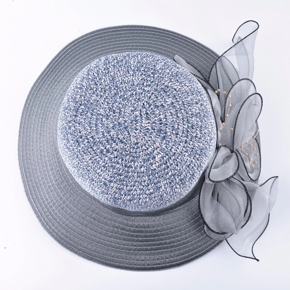 Handgefertigter Strohhut mit Schleife im Blumenlook.