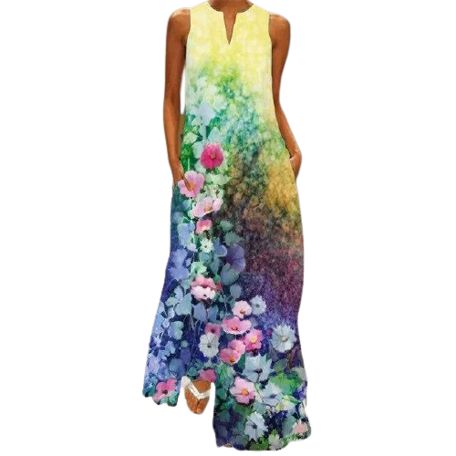 Langes Kleid. V-Ausschnitt. Ärmellos. Mehrfarbig.
