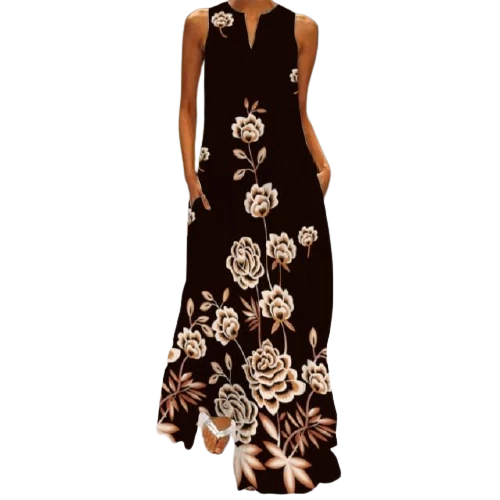 Langes Kleid. V-Ausschnitt. Ärmellos. Mehrfarbig.