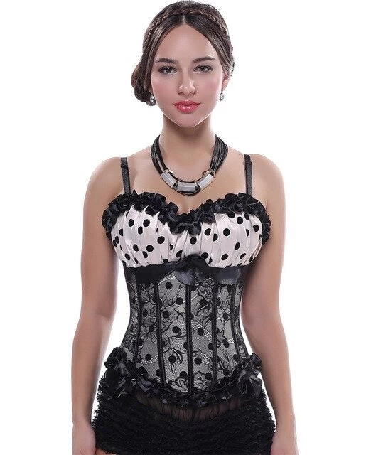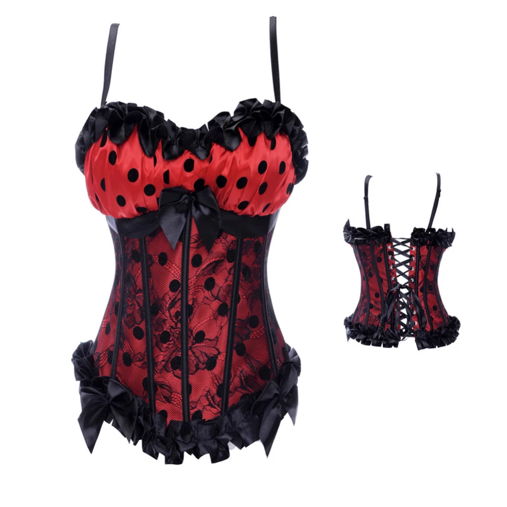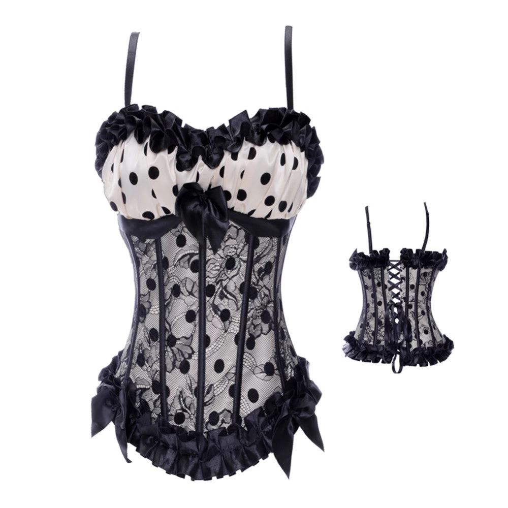 Korsett mit Satin-Tupfenriemen mit Spitze und Schleifen.