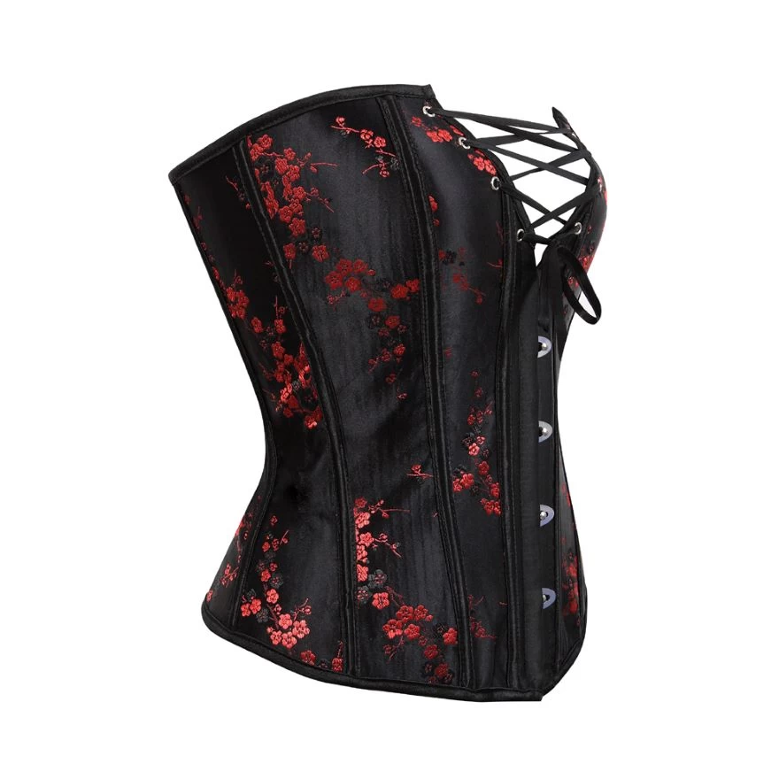 Rotes oder schwarzes Korsett, Satin mit schwarzen Streifen und verschachteltem Ausschnitt.