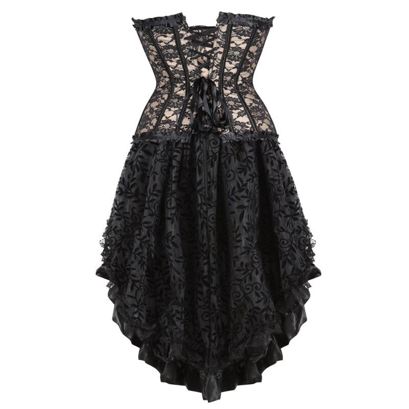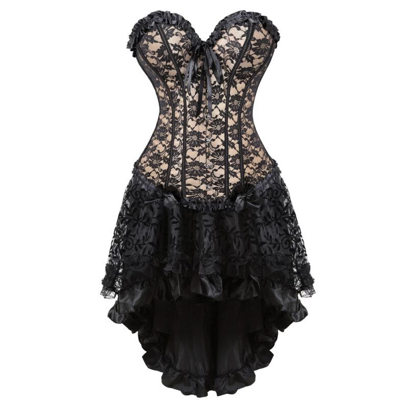 Sexy schwarzes florales Spitzenkorsett mit kurzem Rock.