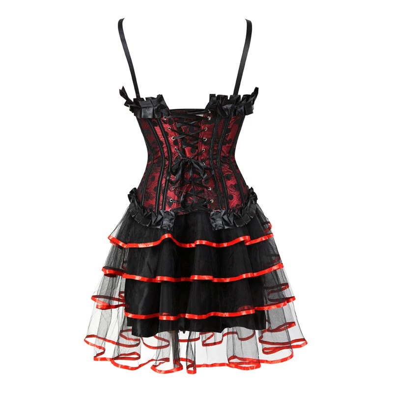 Rotes burleskes Korsettkleid mit schwarzen Tupfen und geschichtetem Tutu-Rock.