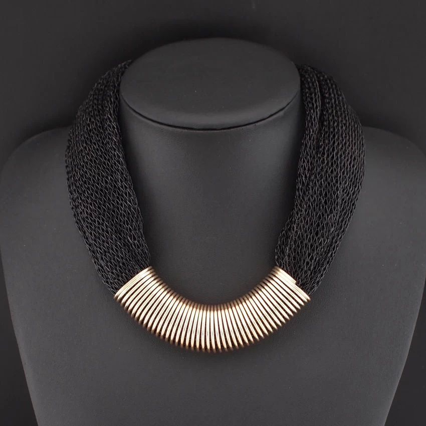 Metallhalsband mit Anhängern, Kordelkette und elegantem Design.