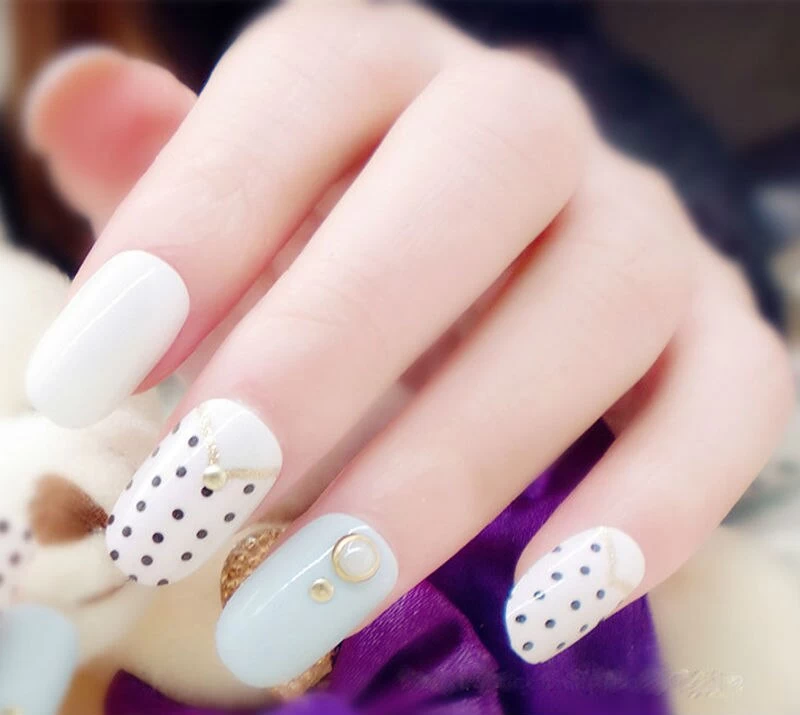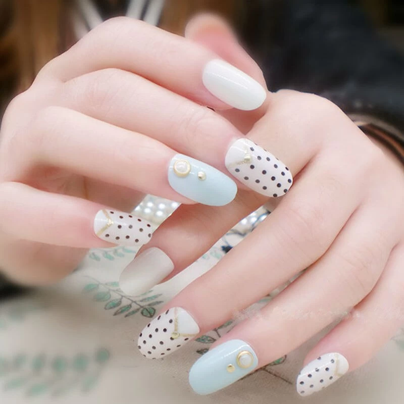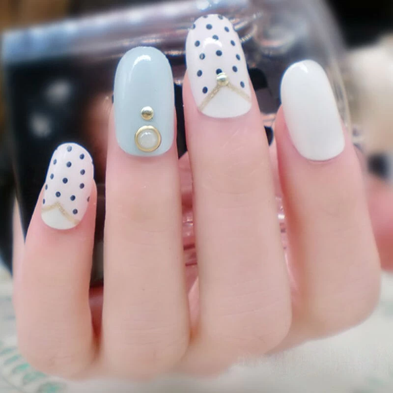 Ovale falsche Nägel in verschiedenen Farben und mit verschiedenen Mustern.