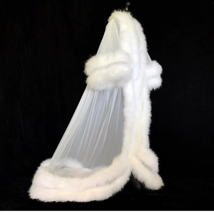 Handgefertigtes elegantes und mit dekorativen Federn verziertes Morgenmantel.