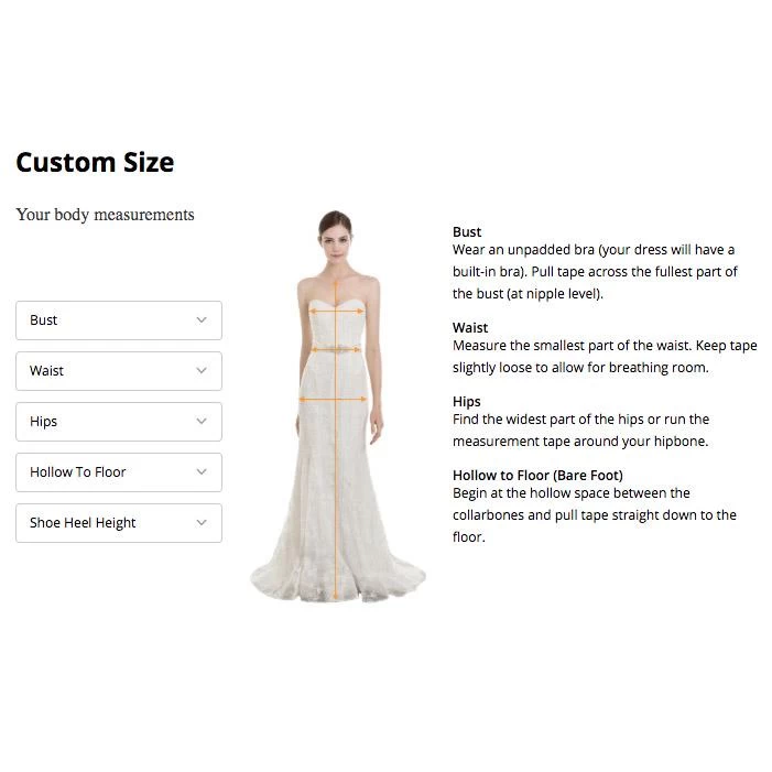 Benutzerdefinierte Größe: Bitte fügen Sie Ihrer Bestellung einen Kommentar hinzu und geben Sie Ihre Maße gemäß der als Bild beigefügten Messanleitung an, und wir fertigen Ihr Kleid nach Maß an.