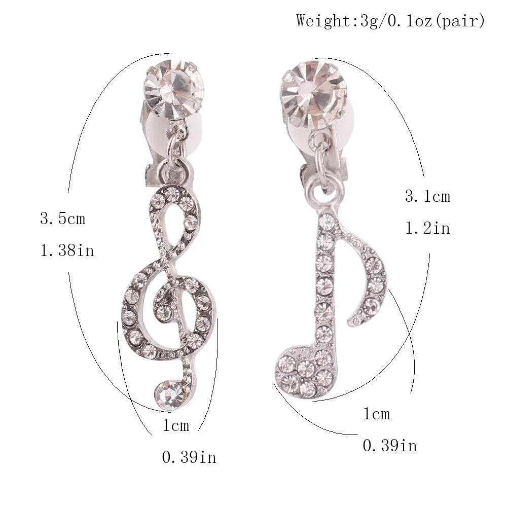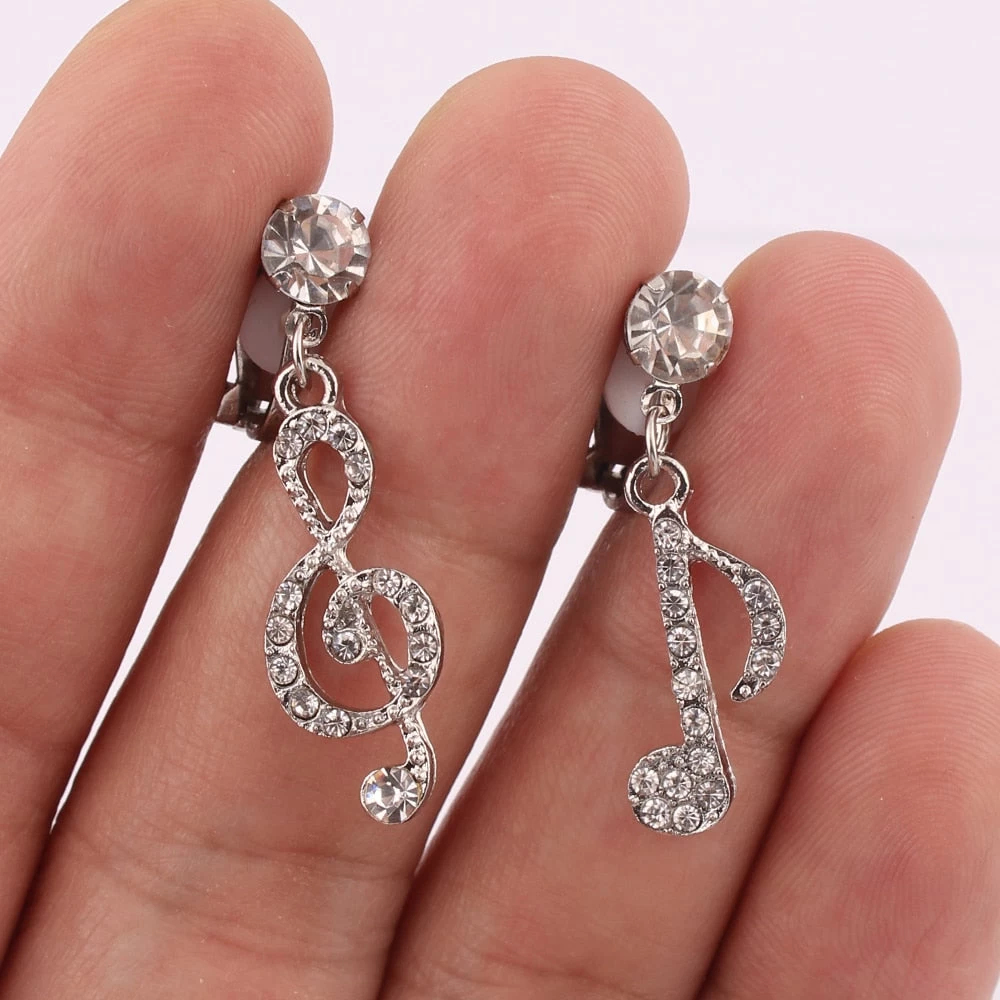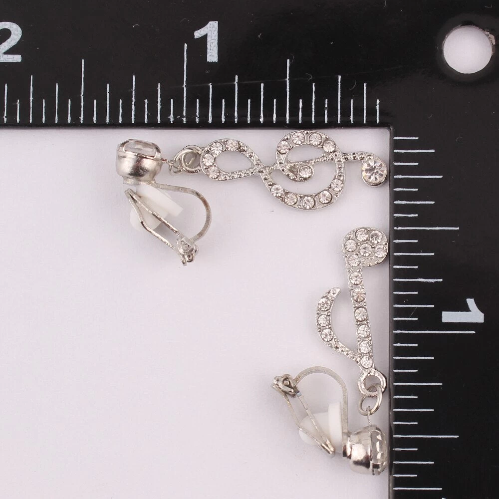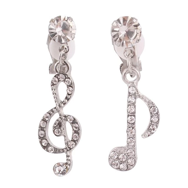 Hängende Clip-Ohrringe in Form einer Musiknote und mit Strasssteinen.