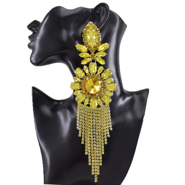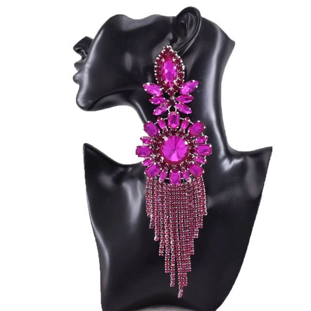 Riesige Ohrclips mit quastenförmigem Anhänger an Riemen.