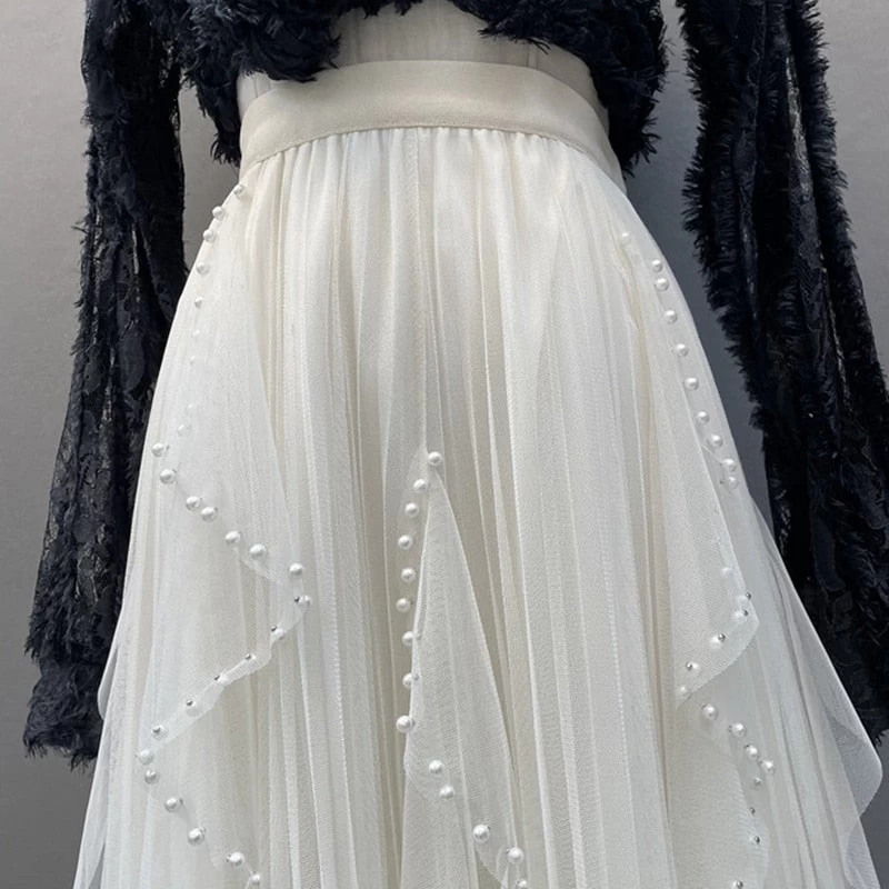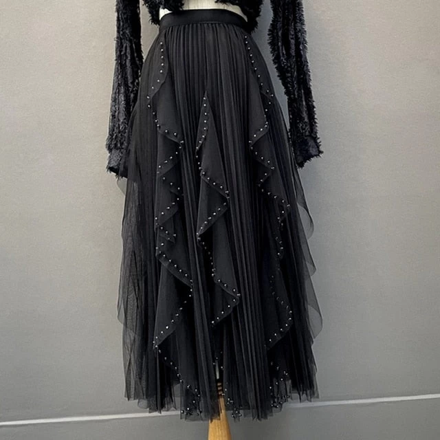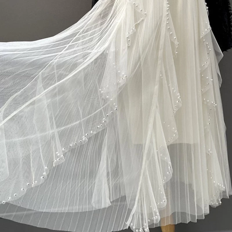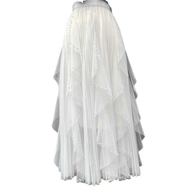 Langer Faltenrock mit Trägern aus Kunstperlen.
