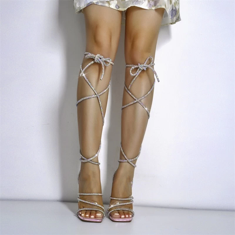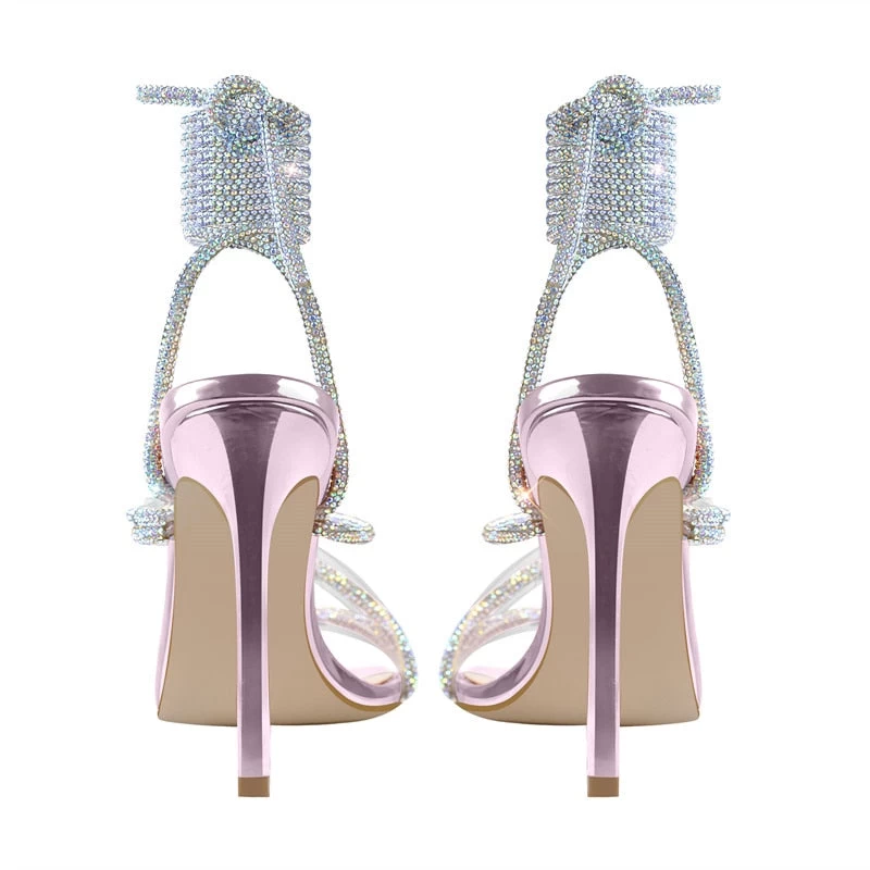 Handgefertigte Sandalen mit hohem Absatz und eckiger Zehenpartie. Dünner Absatz mit Knöchelriemchen.