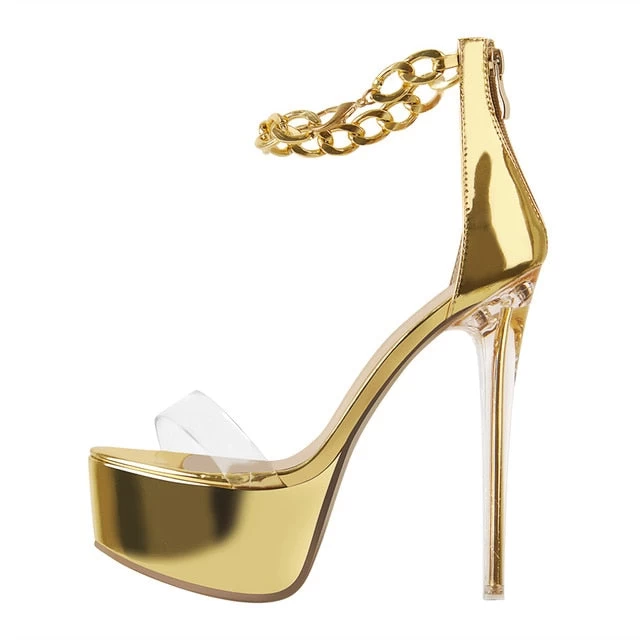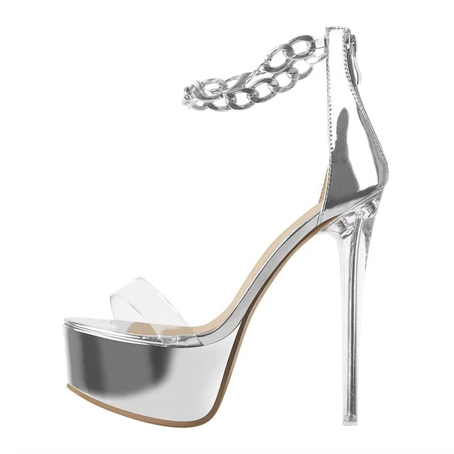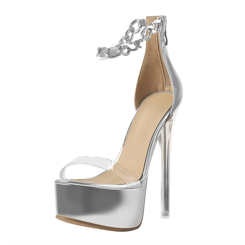Handgefertigte Sandalen mit hohem Absatz und Offener spitze. Plattformen und Metallkette.
