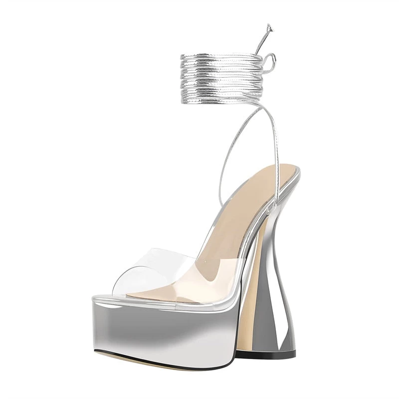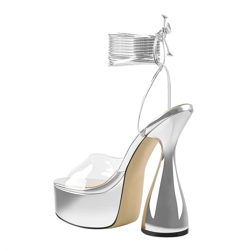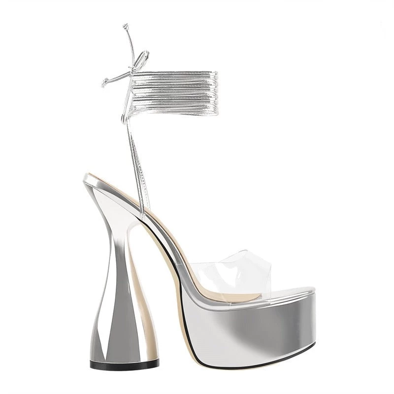Handgemachte Sandalen mit hohem Absatz und Offener spitze. Pfennigabsatz, mit Plateaus und PVC-Folien.