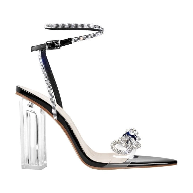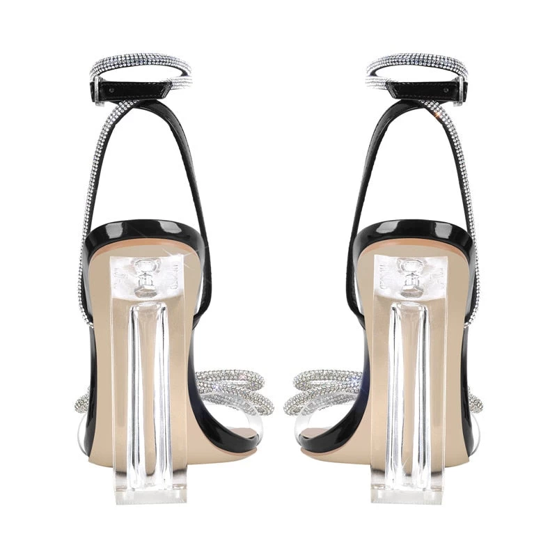 Handgemachte Sandalen mit hohem Absatz und Offener spitze. Elegantes und transparentes Design.