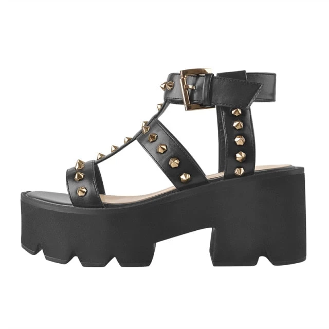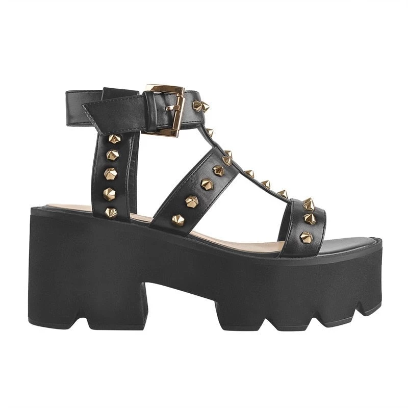 Handgefertigte Sandalen mit Plateau und Peeptoe. Riemen mit Dornschließe und Stachelnieten.