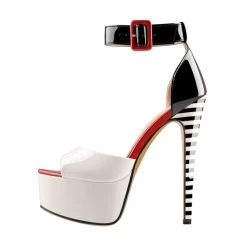 Handgemachte Sandalen mit hohem Absatz und Offener spitze. Dünner Absatz mit Plateaus und Riemen mit Schnalle. Zebra-Ferse.
