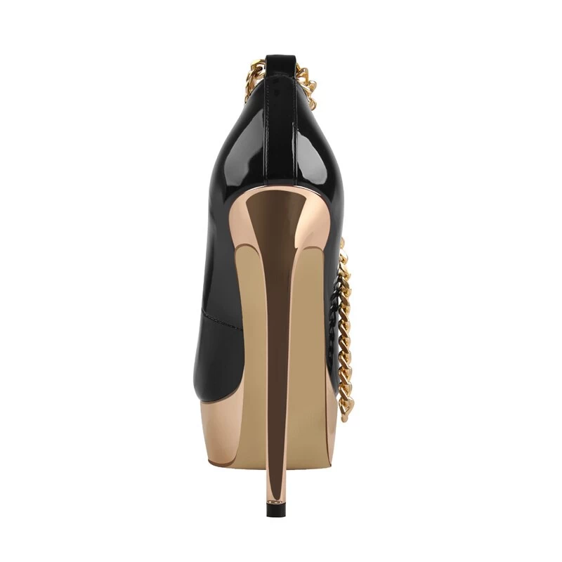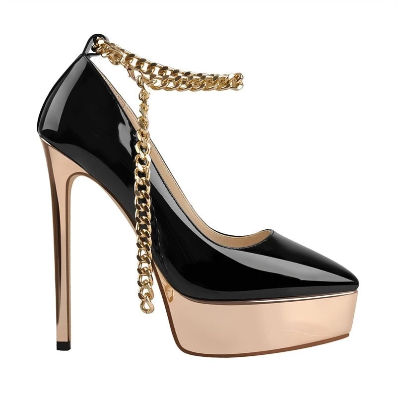 Handgefertigte Schuhe mit hohen Absätzen und spitzer Zehenpartie. Plattformen und Metallkettendekoration.