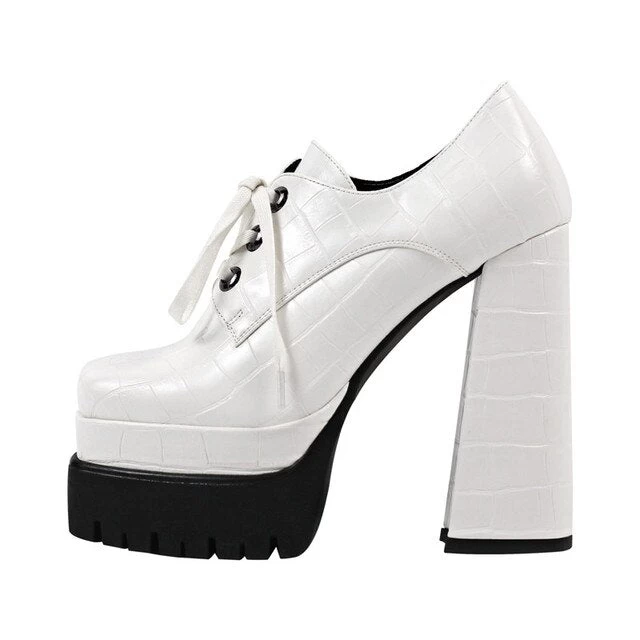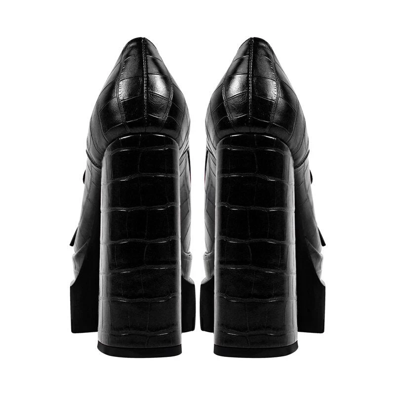 Handgefertigte Schuhe mit hohen Absätzen und runder Schuhspitze. Blockabsatz mit Plateaus und Prints.