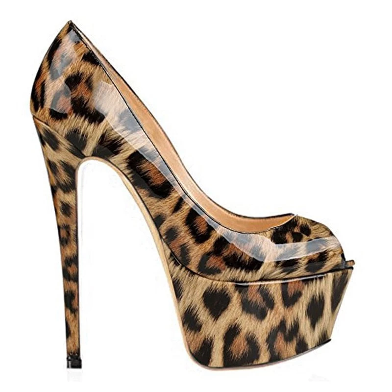 Handgefertigte Schuhe, High Heels und Peeptoes. Dünner Absatz mit Plateaus und Leopardenmuster.