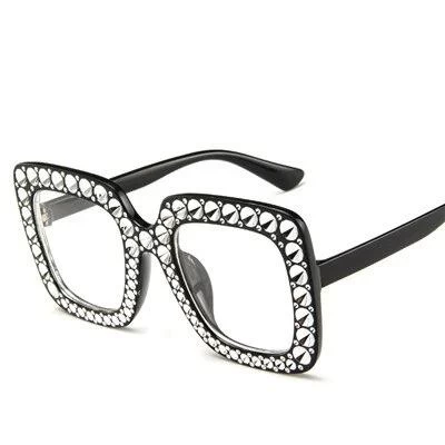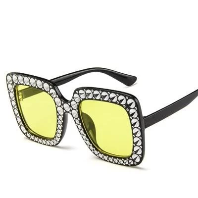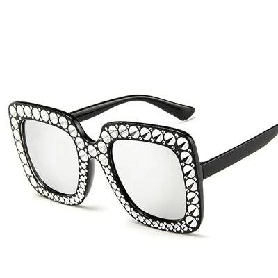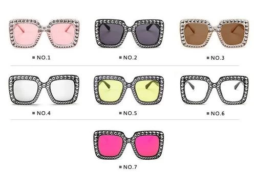 Sonnenbrille mit großen quadratischen Gläsern mit einem mit Kristallen verzierten Kunststoffrahmen.