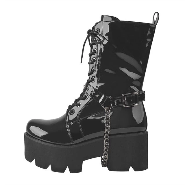 Handgefertigte Stiefel mit dickem Absatz und Plateaus. Punk-Stil mit dekorativen Ketten. Aus schwarzem Lackleder.