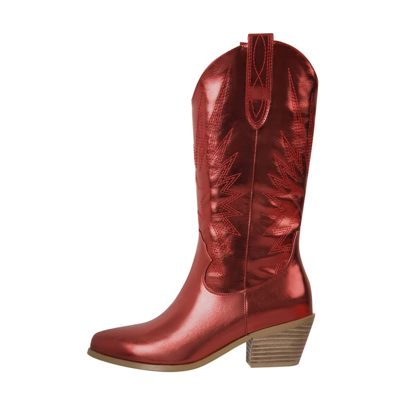 Handgefertigte Stiefel mit Blockabsatz und spitzer Zehenpartie. Halbhohe Stiefel im Western-Cowboy-Design.