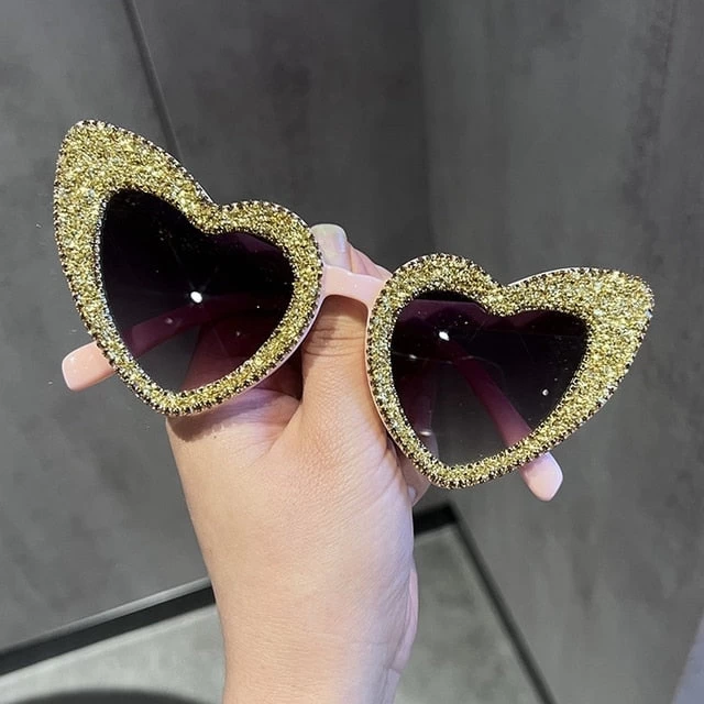 Herzförmige Sonnenbrille im Retro-Stil mit strassbesetztem Rahmen.