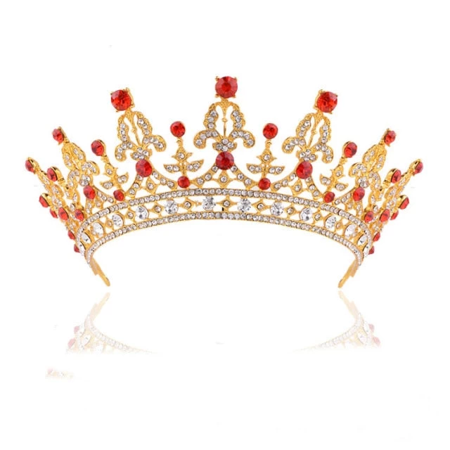 Goldtiara mit Strasssteinen und klaren und roten Kristallen.