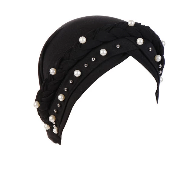 Turban im lässigen Stil, geflochten mit dekorativen Perlen.