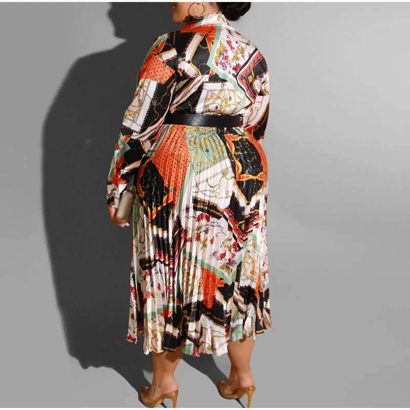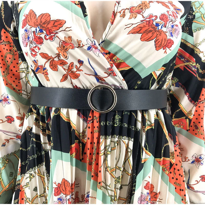 Vintage Kleid mit langen Ärmeln und V-Ausschnitt, mit Gürtel und geometrischen Drucken.